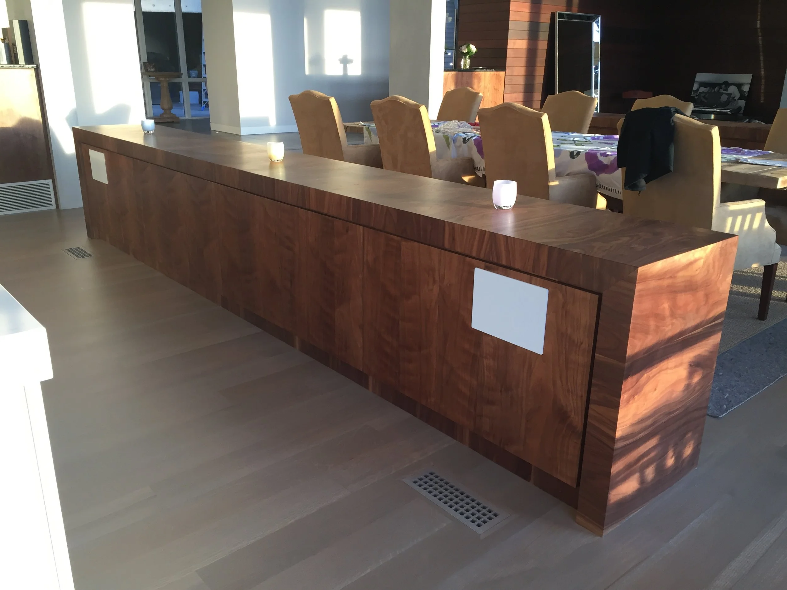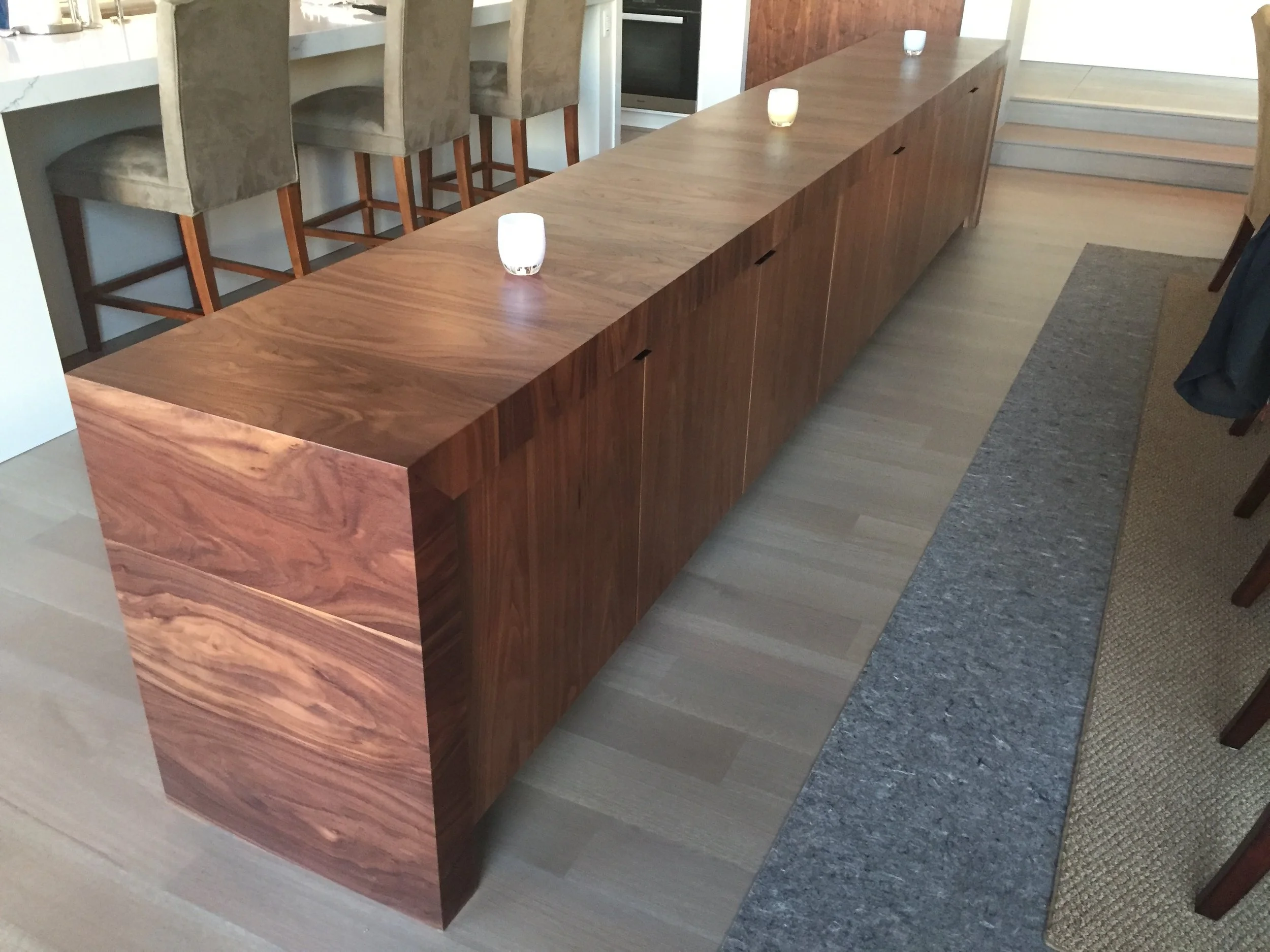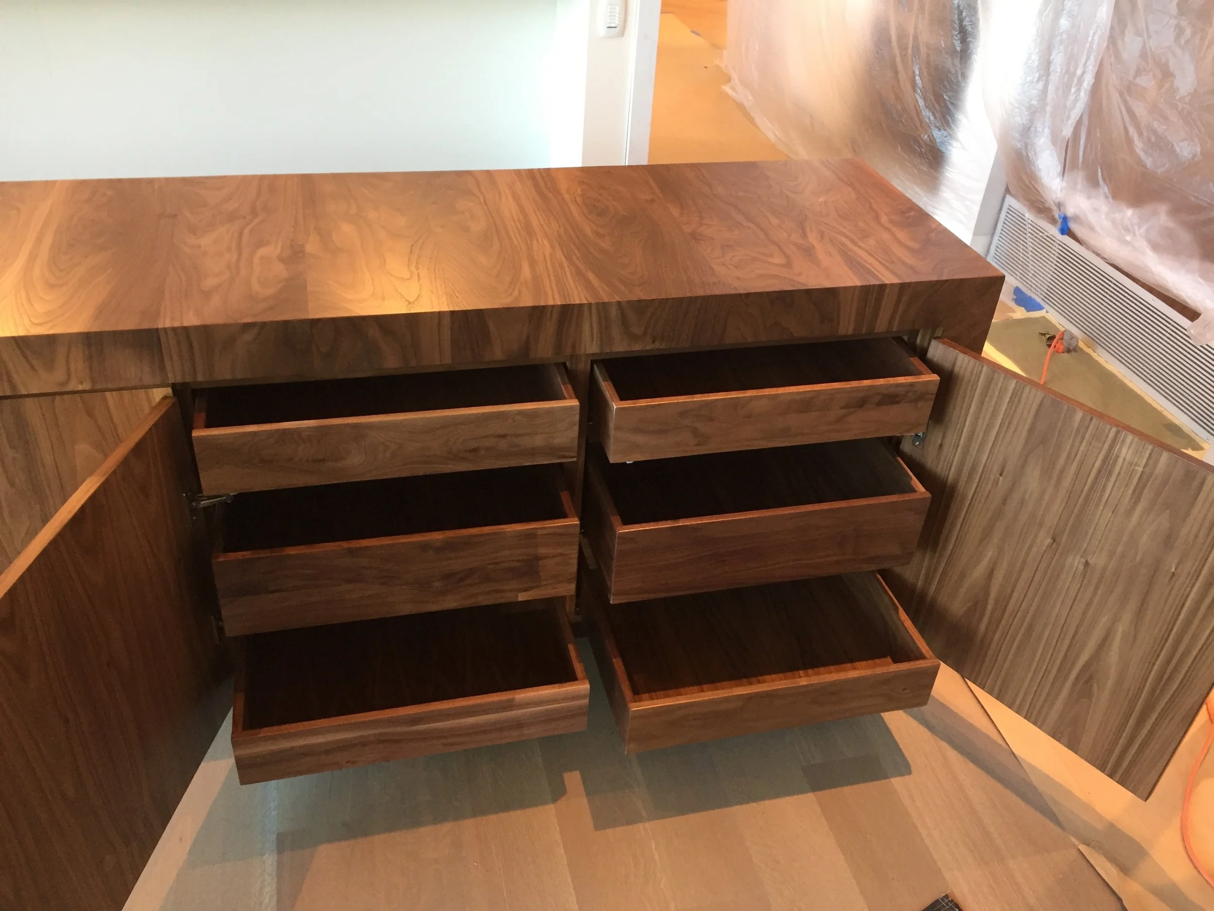 This project is a great example of what we are able to do with veneer. Our company does not use factory made veneer, rather we cut out our veneer and in doing so our is much thicker. We cut it at 1/8in thickness and finished up at 3/32”. Making furniture with veneer allows us to make furniture that would not be possible in solid wood. Wood moves, shrinks and expands, with the seasons ware as veneer glues to a cabinet grade plywood does not. I love the water fall look of this piece with the black walnut tracks it truly is a sight to behold.